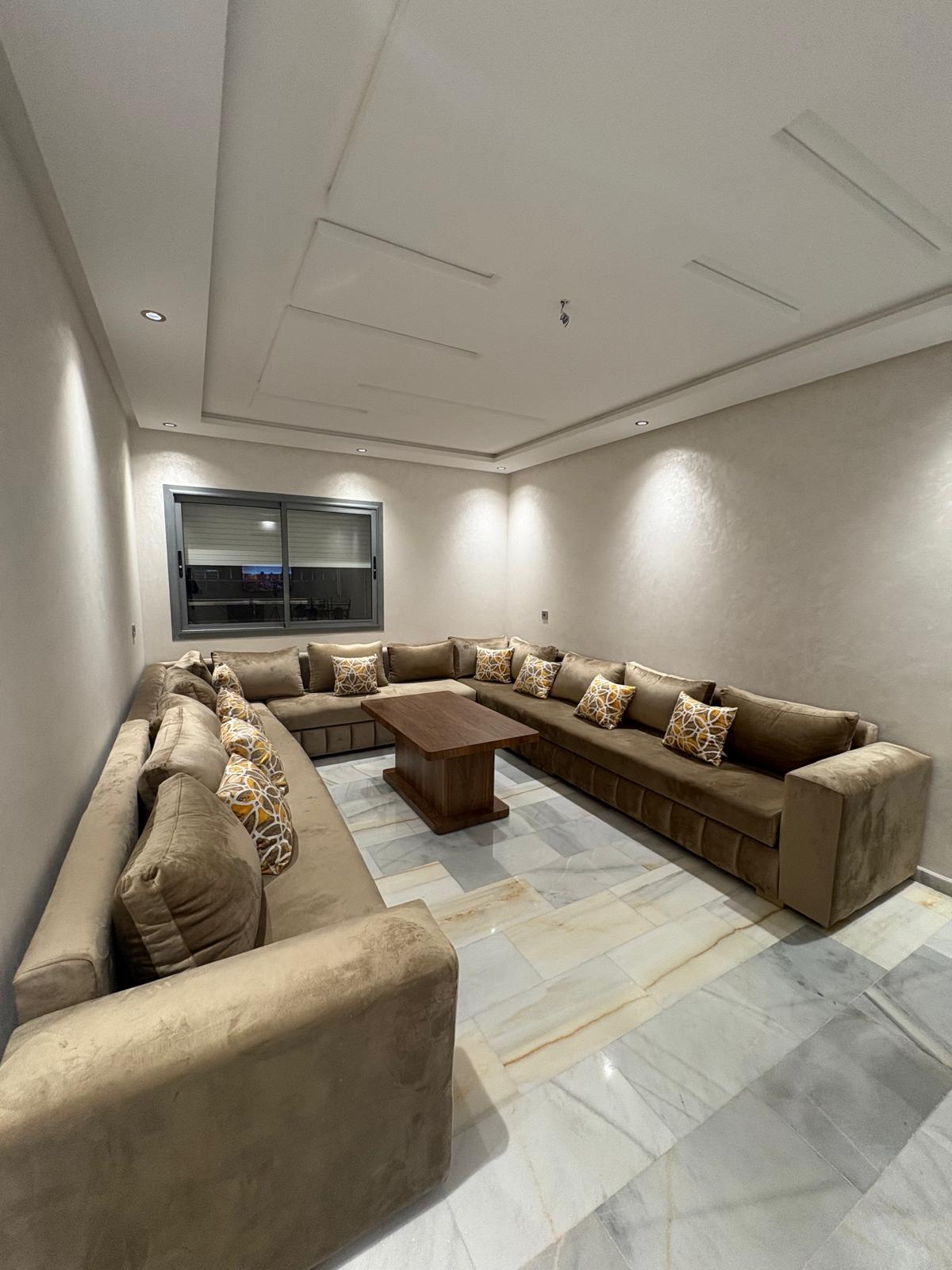 Un salon spacieux et lumineux, décoré avec goût, offrant une ambiance chaleureuse et conviviale, parfaite pour recevoir en toute élégance.